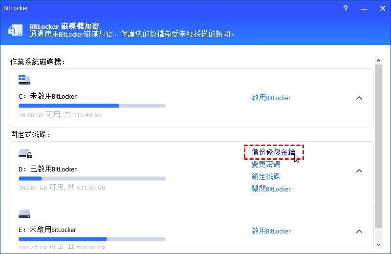 通常,有4個選項可用於管理BitLocker加密:備份修復金鑰、變更密碼、鎖定磁碟區和關閉BitLocker。