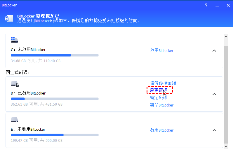 1.找到要變更密碼的加密磁碟區,然後點擊“變更密碼”選項。