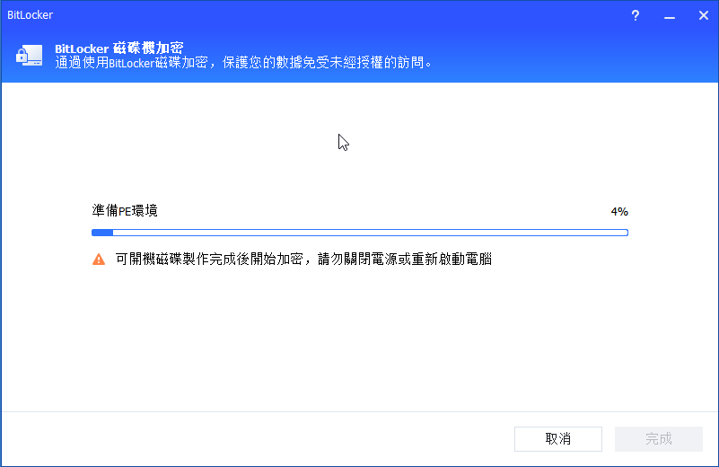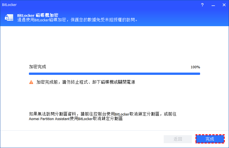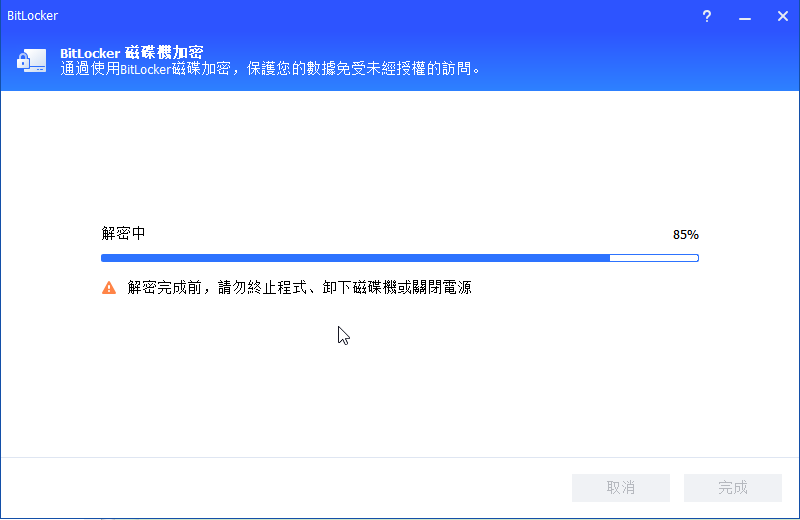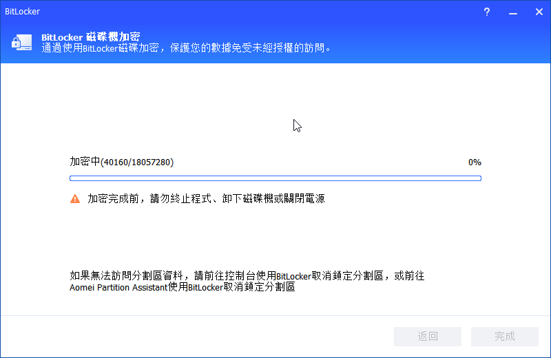 ✍在加密或解密過程完成之前,請不要終止程式、移除磁碟區或關閉電源。