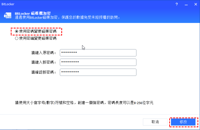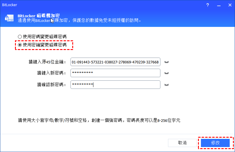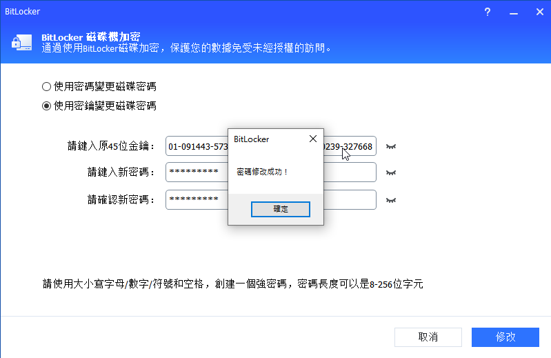 如果選擇“使用密鑰變更磁碟區密碼”,請先輸入在加密磁碟區時保存的修復金鑰,然後輸入一個新密碼,然後確認新密碼。全部設定完成後,請點擊“修改”按鈕。