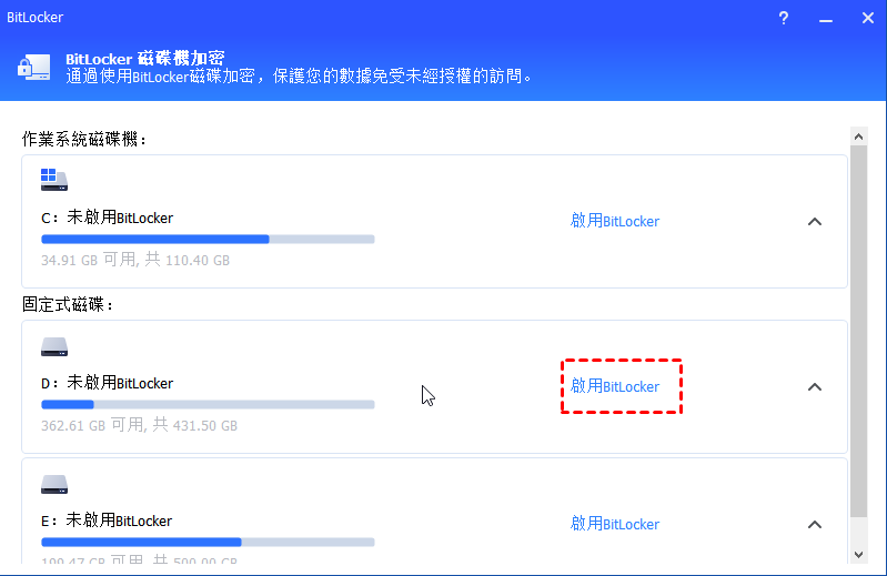 2.顯示系統上的所有磁碟區,包括作業系統磁碟區、固定數據磁碟區和可移動磁碟區。請找到要加密BitLocker的分割區,然後點擊“啟用BitLocker”選項。 (這裡,我們以D槽為例。)