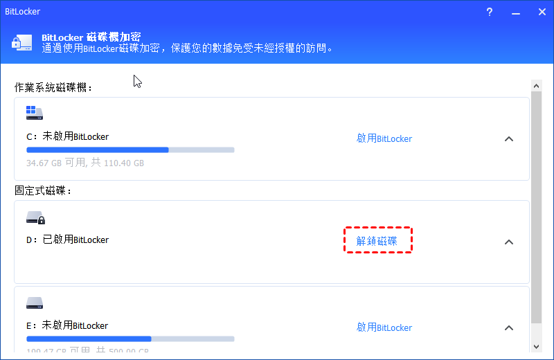 ✍不支援動態磁碟區BitLocker加密。