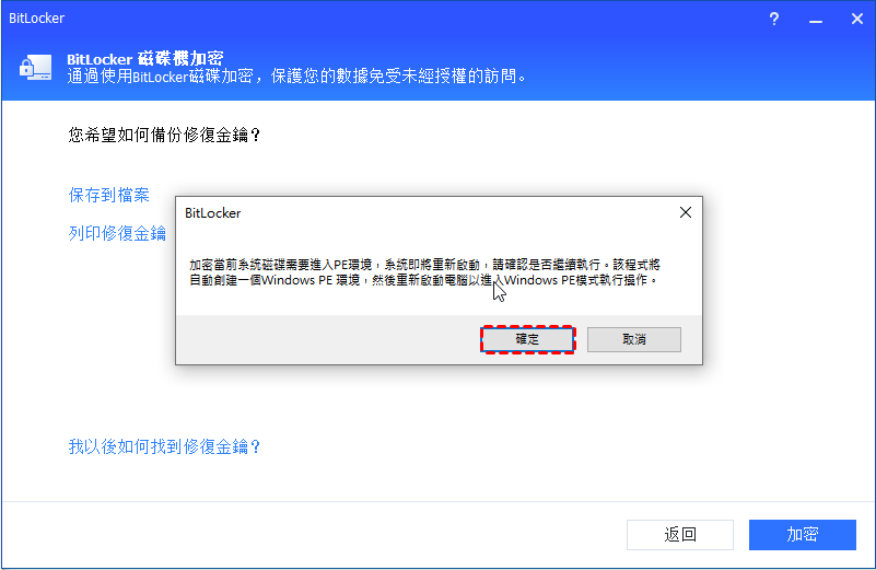 成功創建後,電腦將重新啟動進入Windows PE模式以加密磁碟區。加密完成後,您將獲得一個加密完成的窗口,您可以點擊“確定”重新啟動電腦。