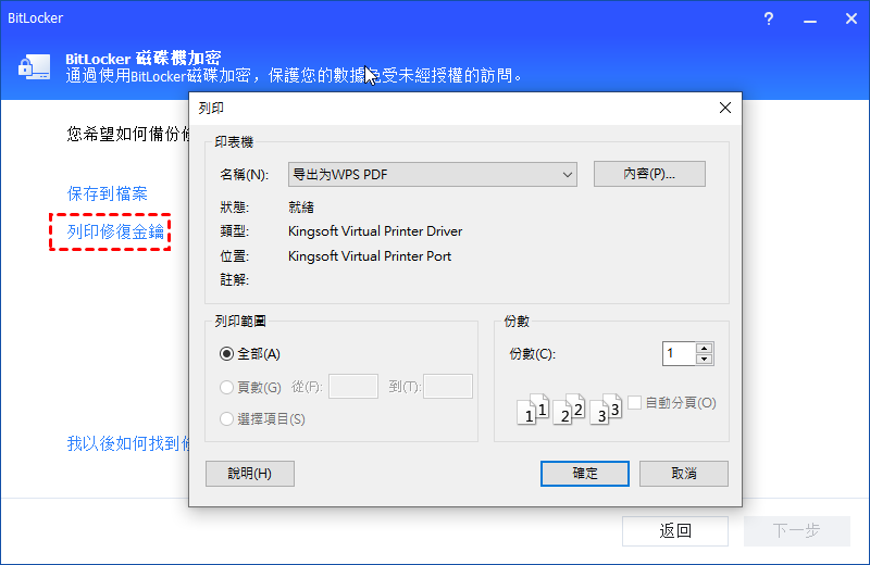 如果選擇“列印修復金鑰”,它將啟用您電腦上的打印功能來列印修復金鑰。