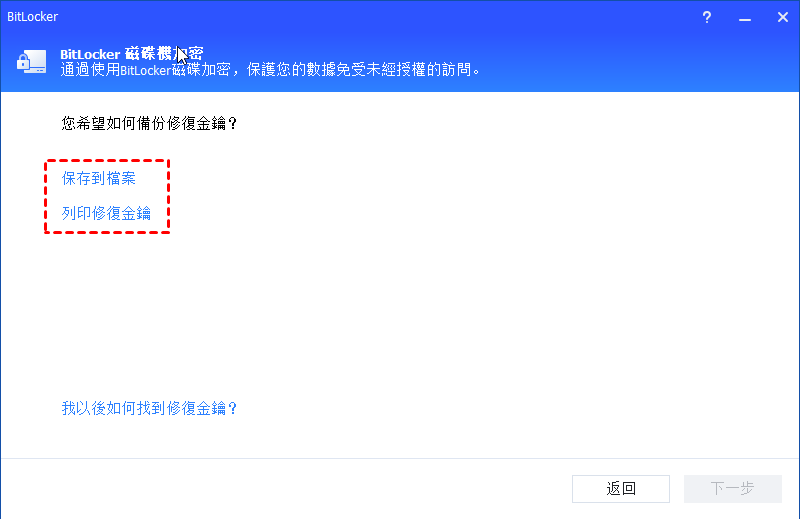 4.選擇一種方法來備份您的恢復金鑰。您可以選擇“保存到檔案”或“列印修復金鑰”。