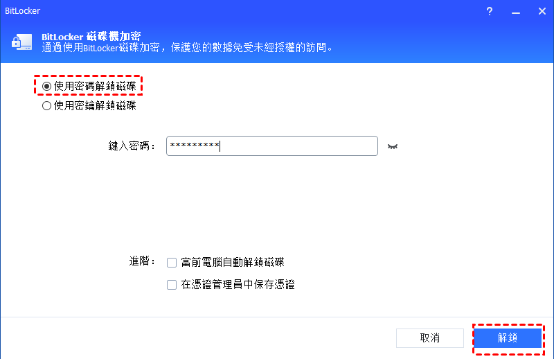 如果選擇“使用密碼解鎖磁碟區”,請輸入正確的密碼,然後點擊“解鎖”按鈕。