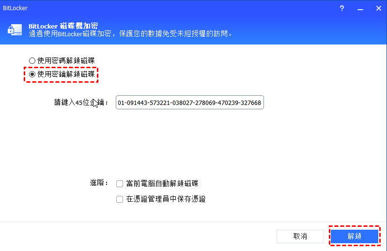 如果選擇“使用恢復金鑰解鎖磁碟區”,請輸入在加密磁碟區時保存的恢復金鑰,然後點擊“解鎖”按鈕。