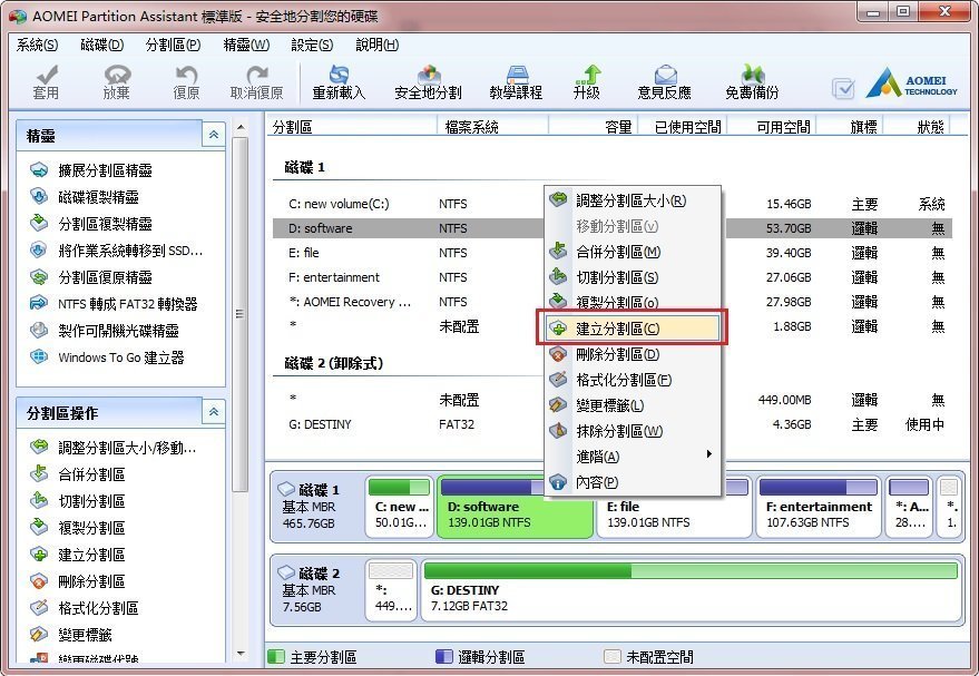 AOMEI Partition Assistant提供兩種方式去創建分割區,請選擇您覺得最便捷的方式。