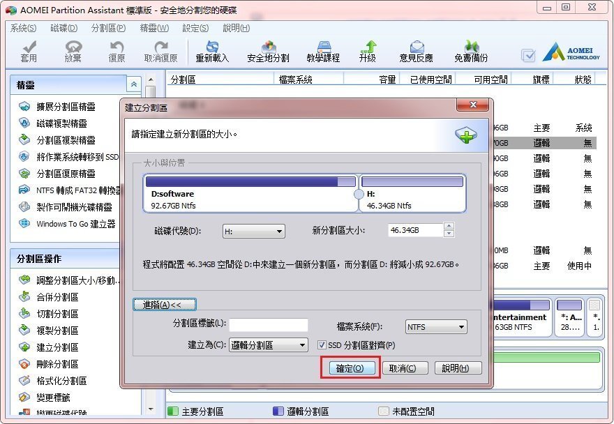 步驟二、點擊“高級>>”去確定為您的新分割區確定基本信息,包括分割區大小,分割區卷標,磁碟機代號,檔案系統(NTFS或者FAT),以及分割區類型(邏輯分割區或者主要分割區)。您也可以通過拖拽邊緣區調整分割區的大小。當所有設置完成,請點擊“確定”繼續。