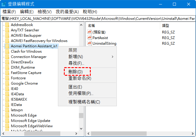 第 2 步:前往以下路徑,刪除 AomeiPartition Assistant_is1 機碼。