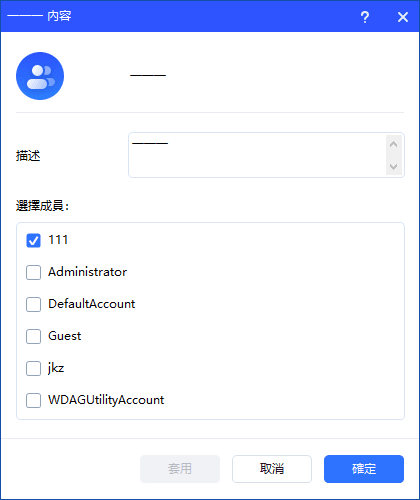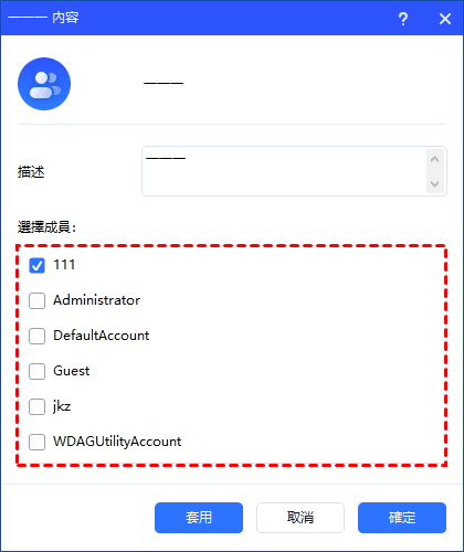 點選“加入群組”選項可變更群組描述,並向群組中新增/刪除使用者帳戶。點選“套用”或“確定”即可套用變更。