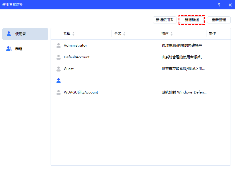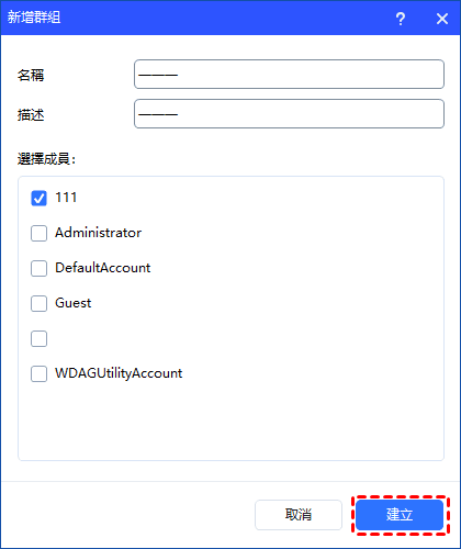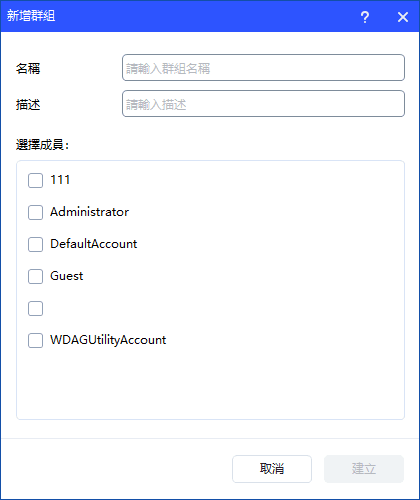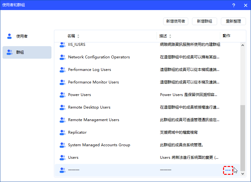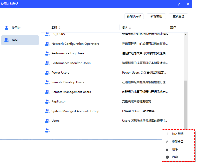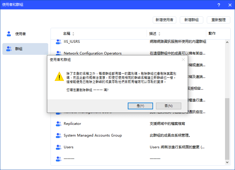 - 部分預設內建群組(例如:Administrator、Users、Guests 等)無法刪除。