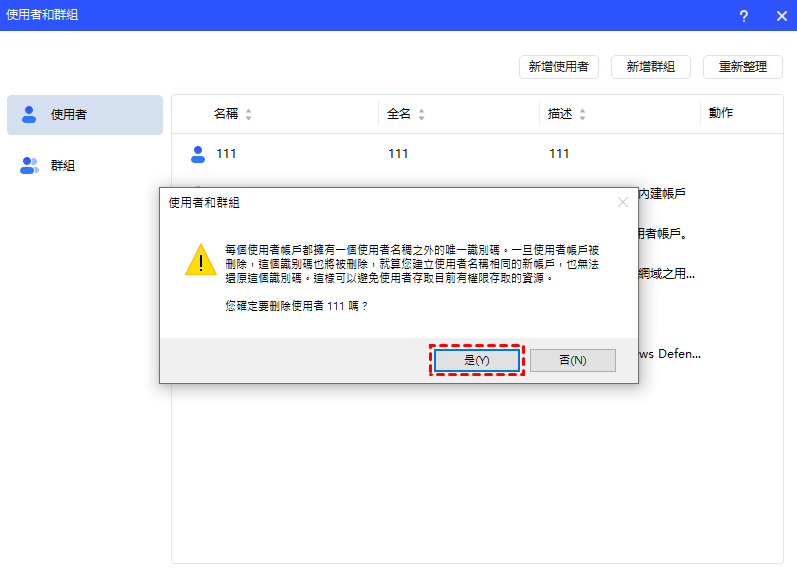 您將看到一個彈出視窗,提示刪除使用者帳戶將刪除其識別符號。確認後,單擊“是” ,然後該帳戶將被直接刪除。