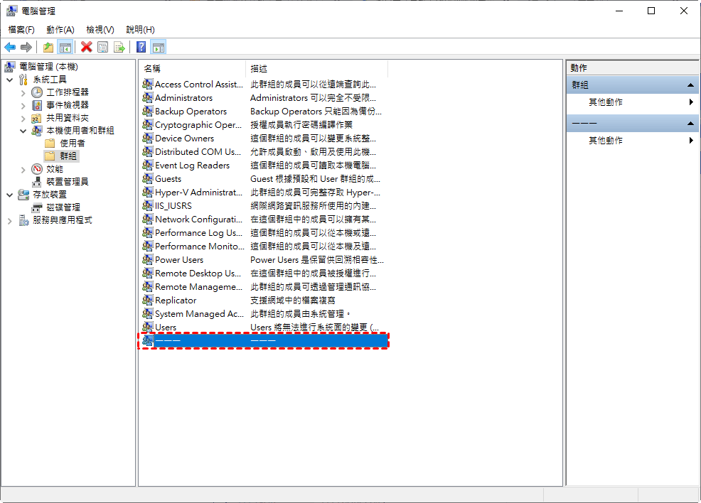 最後,您可以在 Windows 本機使用者和群組中看到該群組已成功建立。並且,您還可以管理新群組。
