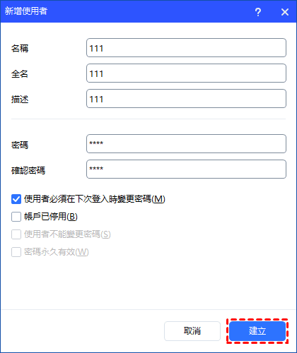 3. 全部設定完成後,點選“建立”即可建立新使用者。