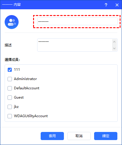 點選“重新命名”選項可變更群組名稱、修改描述以及向群組新增/刪除使用者帳戶。點選“套用”或“確定”即可套用變更。