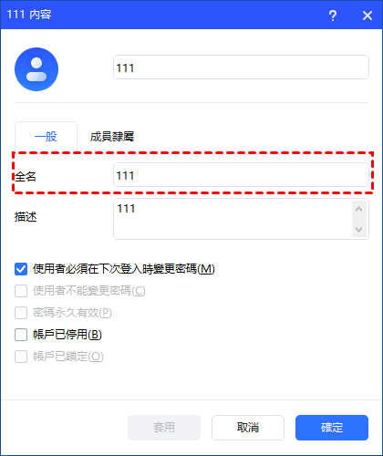 點選“重新命名”選項即可修改使用者。在“一般”選項中,您可以重新命名使用者的全名和描述。您還可以選中或清除使用者設定的核取方塊。點選“套用” 或“確定”即可套用變更。