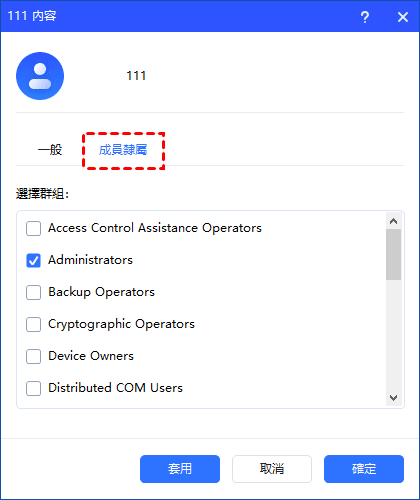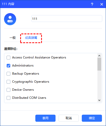 在“成員隸屬”選項下 ,您可以將使用者帳戶新增到群組。點選“套用” 或“確定”以套用變更。
