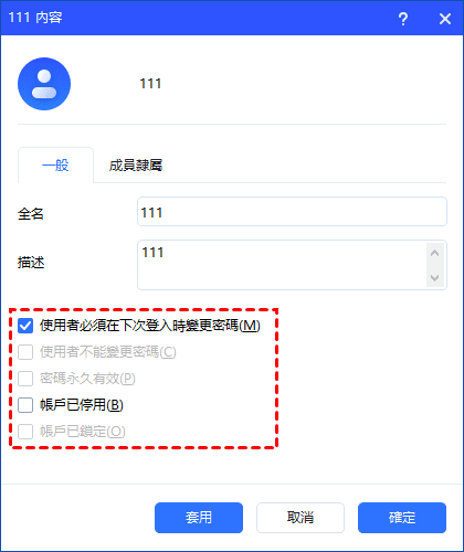您可以選中或清除以下核取方塊:使用者必須在下次登入時變更密碼、帳戶已停用、使用者不能變更密碼、密碼永久有效。