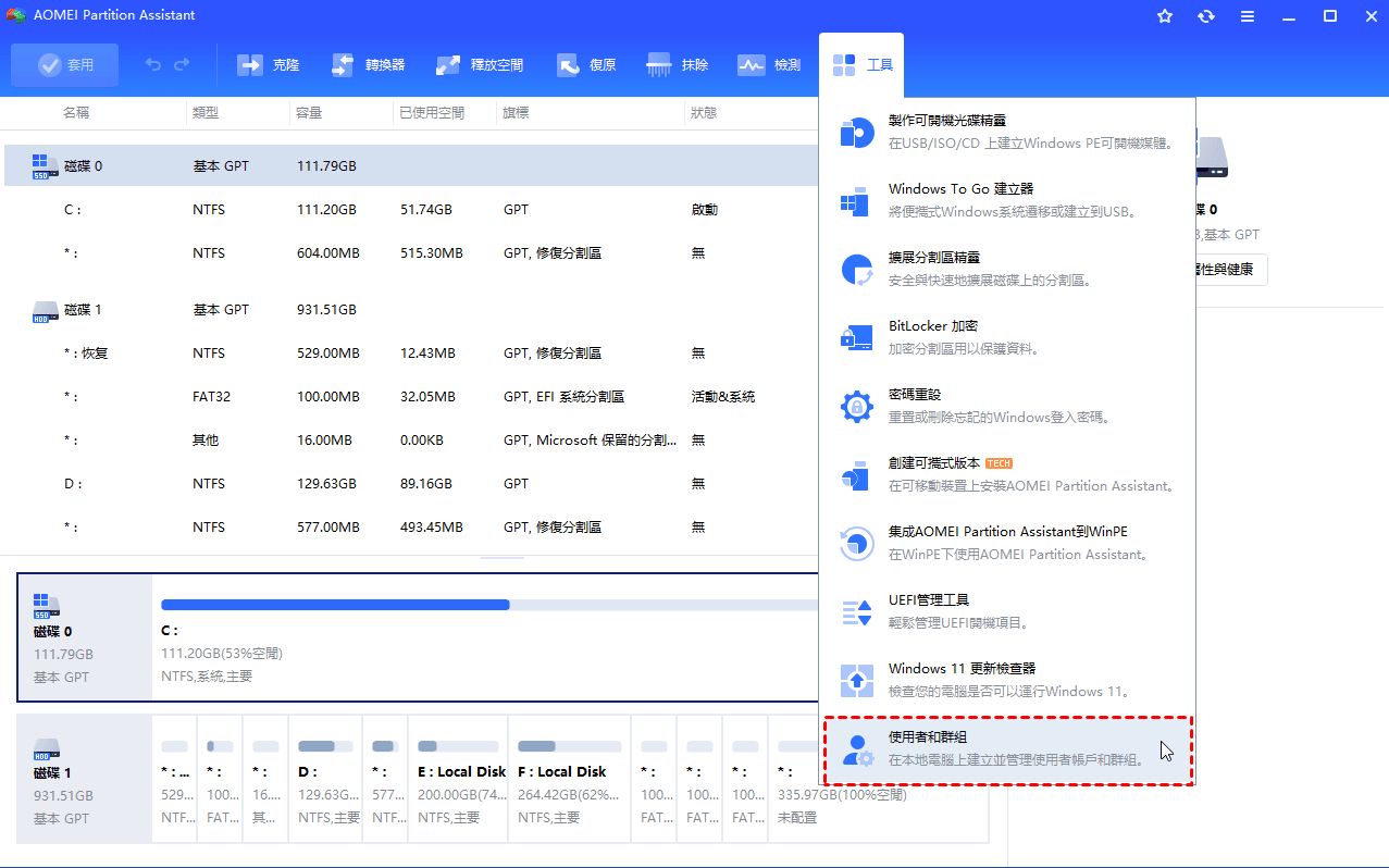 在 AOMEI Partition Assistant 中,新工具“使用者和群組”將幫助您輕鬆地在本機電腦上建立和管理本機使用者帳戶和群組。