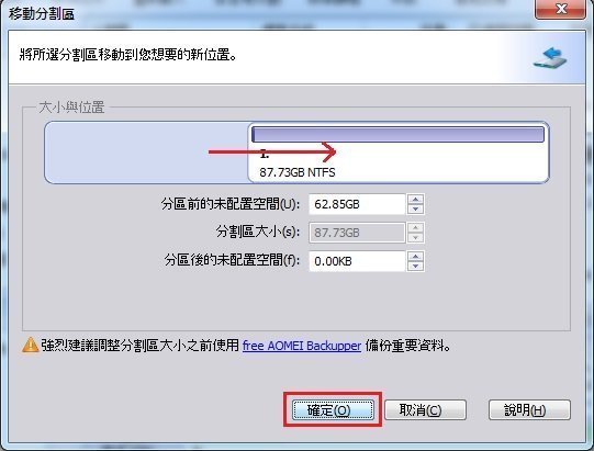 步驟2. 把滑鼠的光標移動到選擇的分割區上,當它變成十字星時,按住滑鼠左鍵,把它向右拖拽。拖到適當的位置,然後點選“確定”。