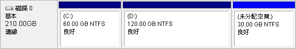 假設您的磁碟上有一個C槽、D槽和一個未配置空間,為了能用未配置空間來擴展C槽,您需要依照以下步驟將D槽移到未配置空間後,使C槽緊鄰未配置空間左側。