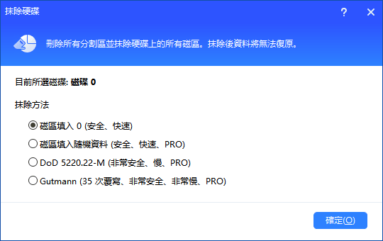 步驟2:在新的視窗中,選擇一種擦除磁碟的方法,例如“磁區填入0”。點選“確定”。您也可以嘗試其他三個選項:磁區填充為隨機資料、DoD 5220.22-M和Gutmann。