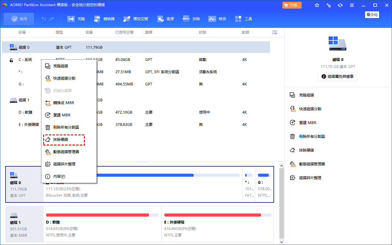步驟1:在主介面中,右鍵點選目標硬碟,選擇“抹除硬碟”。