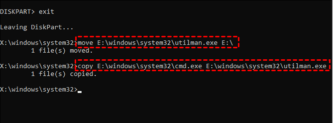 move E:\windows\system32\utilman.exe E:(將utilman.exe檔案移動到系統磁碟機的根目錄)