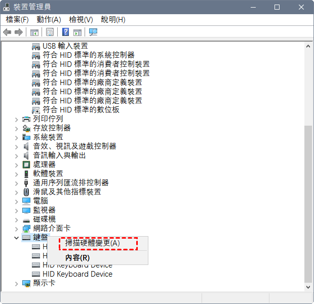 5、再次右鍵點選“鍵盤”,選擇“掃描硬體變更”就可以自動重新安裝鍵盤的驅動程式了。