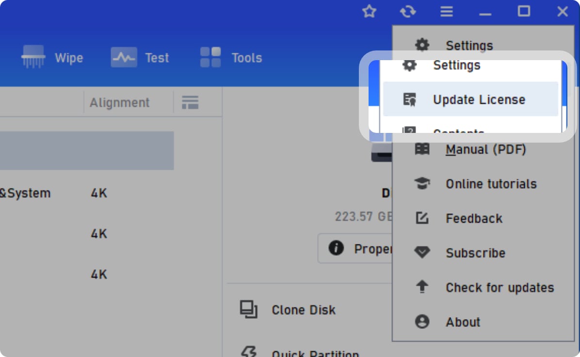 返回到AOMEI Partition Assistant,點擊右上角菜單>“更新註冊碼”。