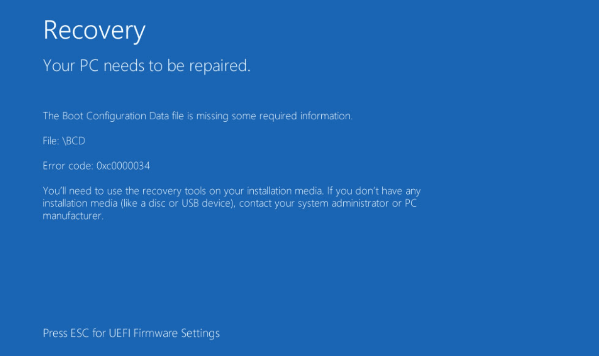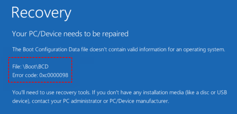 BCD損壞會導致Windows 11/10/8/7電腦無法啟動。以下是BCD 錯誤常見報錯提示之一: