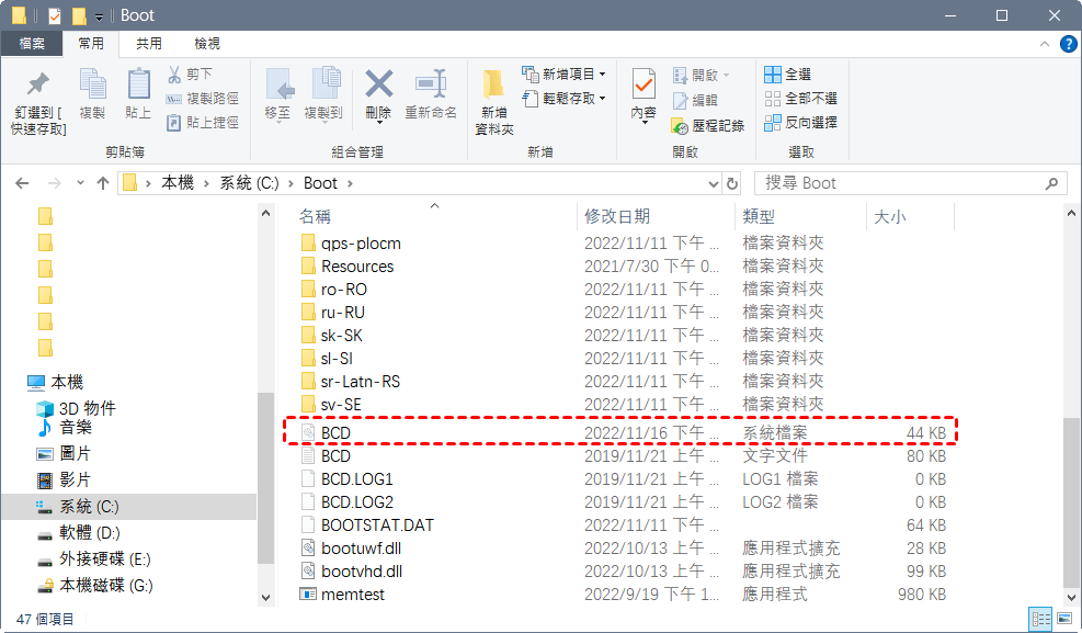 對於傳統的BIOS開機模式,BCD 檔案位於活動分割區上的Boot資料夾 ,通常在系統分割區的「C:\Boot」資料夾。