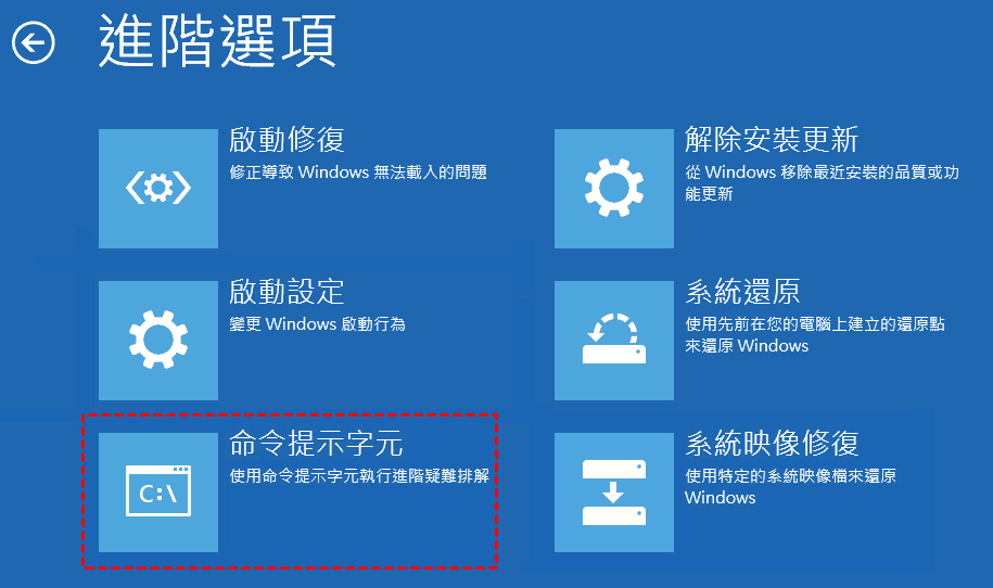 步驟 1. 從可啟動 USB 啟動電腦後,點擊“修復電腦”>“疑難排解”>“進階選項”>“命令提示字元”。