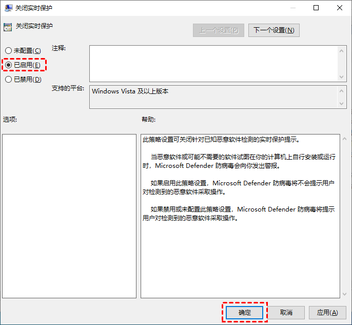 步驟3. 輕按兩下“關閉Microsoft Defender 防毒軟體”,點選“已啟用”,然後點擊“確定”。