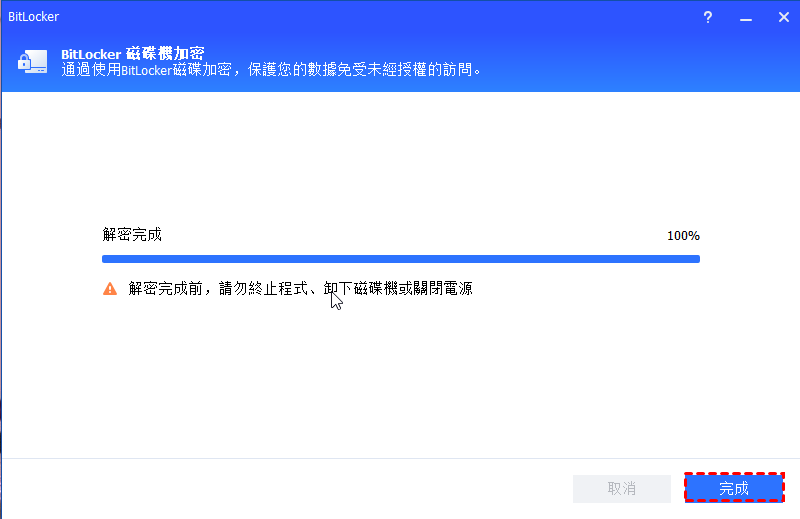 3、一旦解密過程完成,請點擊「完成」。最後,磁碟區上的BitLocker已解密。