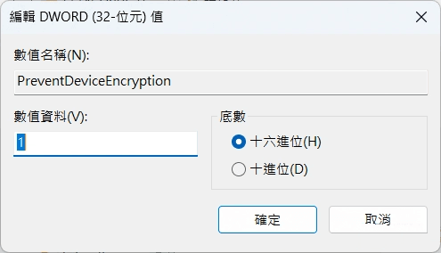 4、新增一個名為「PreventDeviceEncryption」的 DWORD (32 位) 值,並將其值設定為 1,以關閉 BitLocker 自動設備加密。