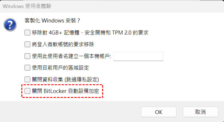 5、在Windows使用者體驗視窗中勾選「關閉 BitLocker 自動設備加密」,然後點選「OK」。