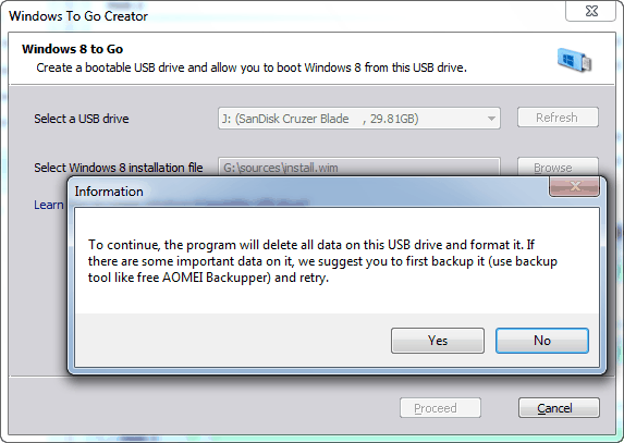 Step3:You will get a message by the software, after reading it, please click Yes, then the converting Windows 8 ISO to USB operation will begain.