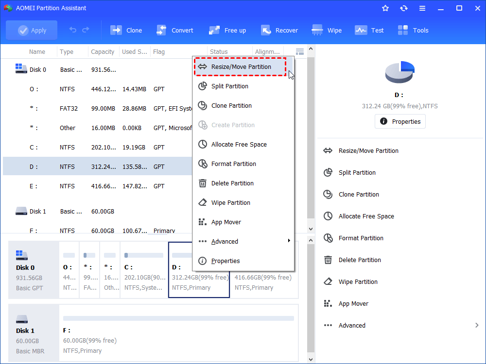 Step 1. Right-click on the partition you want to shrink and select "Resize Partition". You can select C: drive or the drive after it. Here we take D: partition for example. Right click it and choose “Resize/Move Partition”.