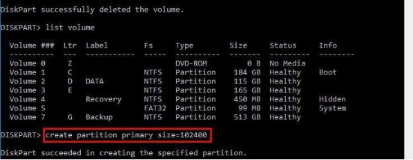 The above command means to create a 102400MB (100GB) primary partition. To create other types of partition, you just need to replace primary with one of the following: