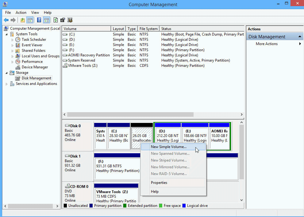 Disk Management is a built-in tool in Windows operating system. It can help you create/shrink/extend/delete partition. Open it by right clicking "My Computer" -> "Manage" -> "Disk Management". To create a new partition, if there is no unallocated space on hard drive, you should shrink the partition to get it at first. And then right click on the unallocated space and choose New Simple Volume.