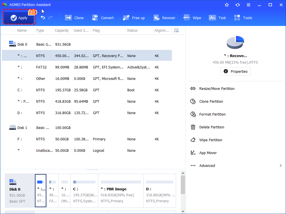 Then, you would not get low disk space error on the PBR image partition anymore. Besides, if you upgrade to Professional edition, you can directly transfer free space from other partitions to the almost full (PBR Image) drive via its “Allocate Free Space” feature. And it also allows you to migrate OS to larger or smaller SSD, convert between MBR and GPT without losing data, convert primary partition to logical, and vice versa.