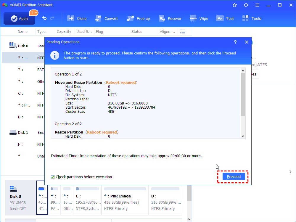 3. Click Apply at the left upper corner, then press Proceed to extend PBR partition.