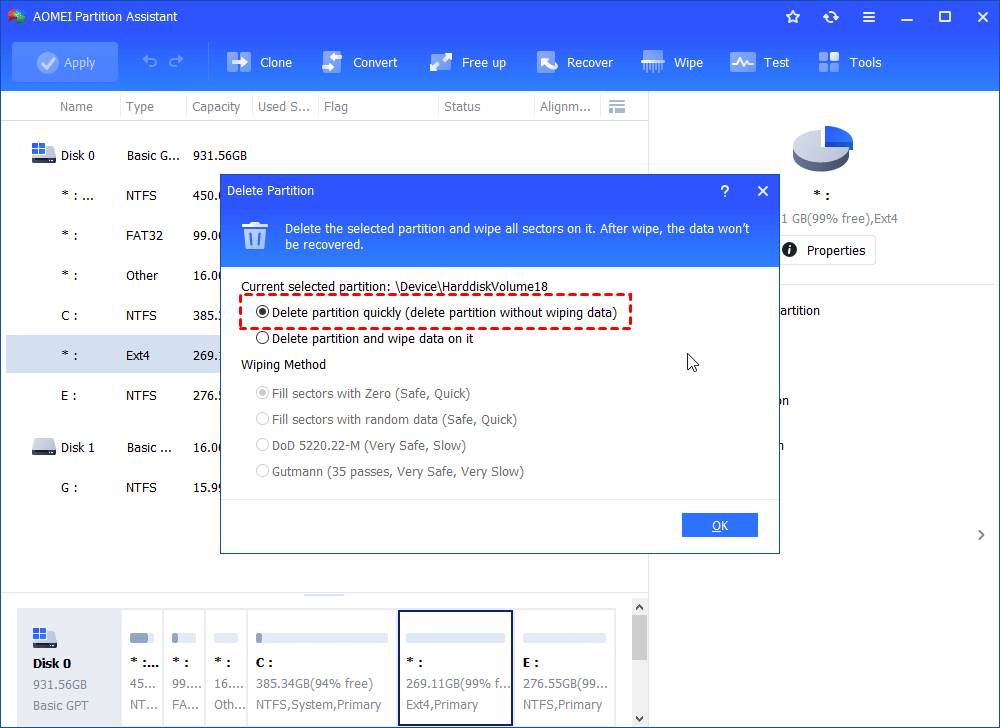 This method is to delete the partition where the OS you want to discard directly. If you are dual booting Ubuntu and Windows and now want to delete the Ubuntu, it is recommended to use the freeware: AOMEI Partition Assistant Standard. If you consider using Windows 10/11 Disk Management to remove dual boot, it may let you down because the Ubuntu OS is installed on Ext3 or Ext4 partition on Windows and the Disk Management cannot recognize such partitons.