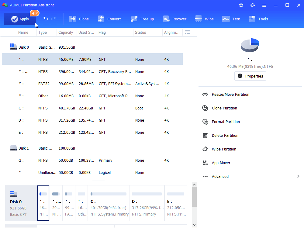 If the GPT disk partition you will resize matches the requirements listed above, the Disk Managment is really a great choice. What if the GPT partition is not NTFS, or is not adjacent to an unallocated space when you need to extend it? Then we would like to recommend you a free partition manager-AOMEI Partition Assistant Standard. This software breaks out all the limitations of Disk Management, and is able to: