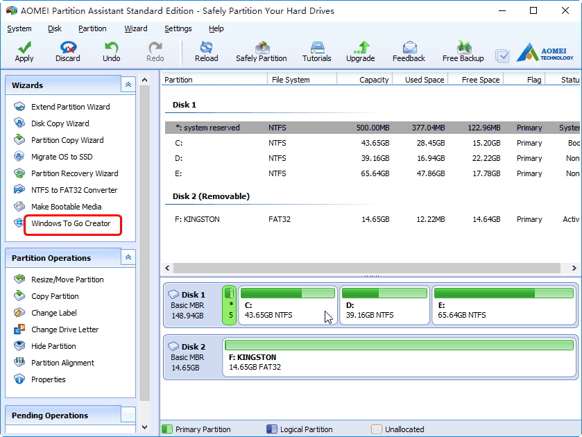Step 1. Connect your USB to the computer, make sure it can be detected. Install and launch AOMEI Partition Assistant, click Tools > Windows to Go Creator to get into this wizard.