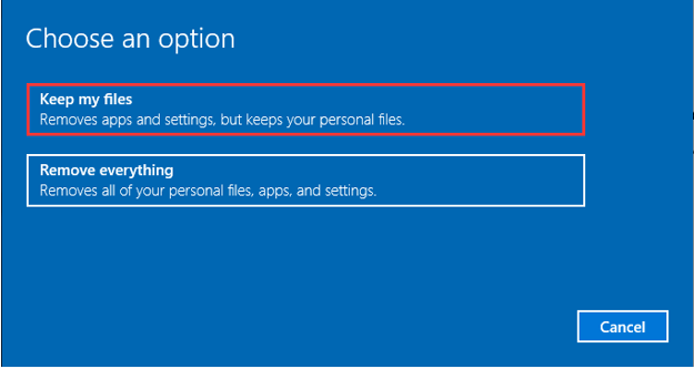 3. Select a reinstalling type. Here, I recommend “Keep my files”. In this way, your Apps and settings will be removed but your personal files will be kept.