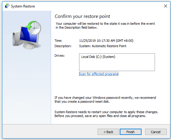 4. Click on “Finish” to confirm the selected restore point.