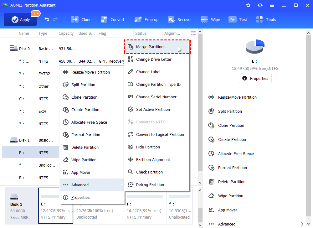 Step 5. Here, we take partition E for example. Right-click on partition E and select "Advanced" > “Merge Partitions”.